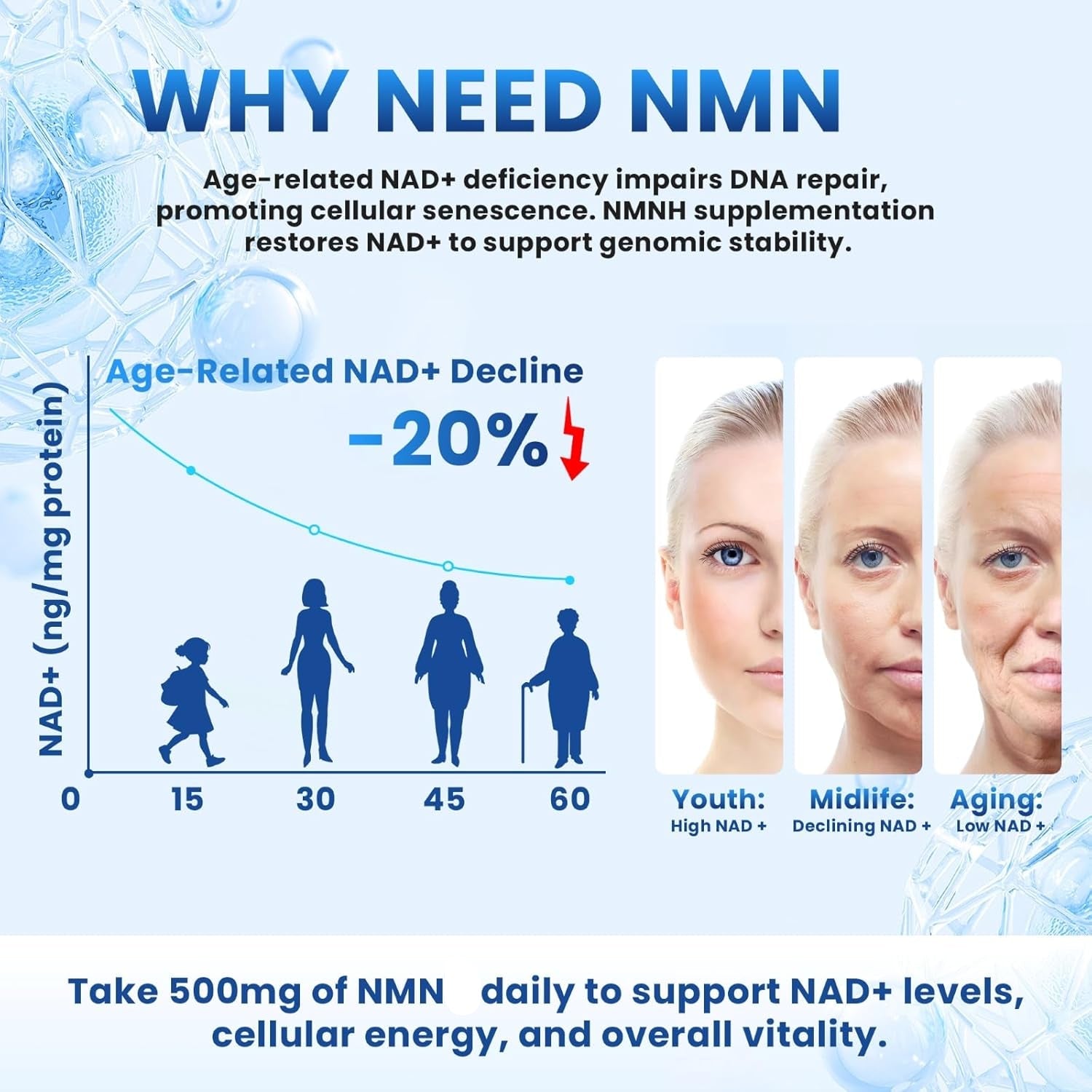 Your body naturally produces NAD+ to power every cell — it fuels your energy, sharpens your brain, repairs your DNA, and keeps your skin looking young. But starting in your 20s, NAD+ levels begin to decline. By age 40, they drop by 50%. By 60? Nearly gone.